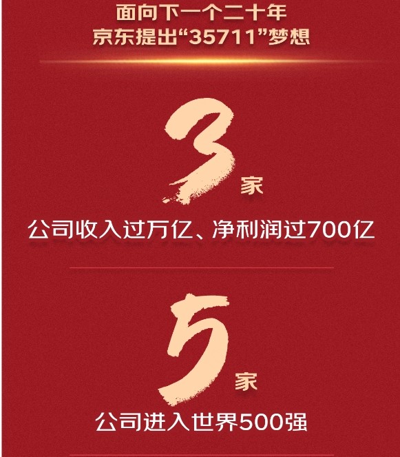 又至618。在这样一个特殊节点,迎来20岁生日的京东对外宣布,将员工、客户、商家、伙伴……每个人的梦想汇聚到一处,共同组成京东“35711”梦想,即: 20年后,京东能有3 家收入过万亿,净利润过700亿的公司;5 家进入世界500强的公司;7 家从零做起市值不低于1000亿的上市公司;能为国家缴纳1000 亿税收;提供超过100万就业岗位。