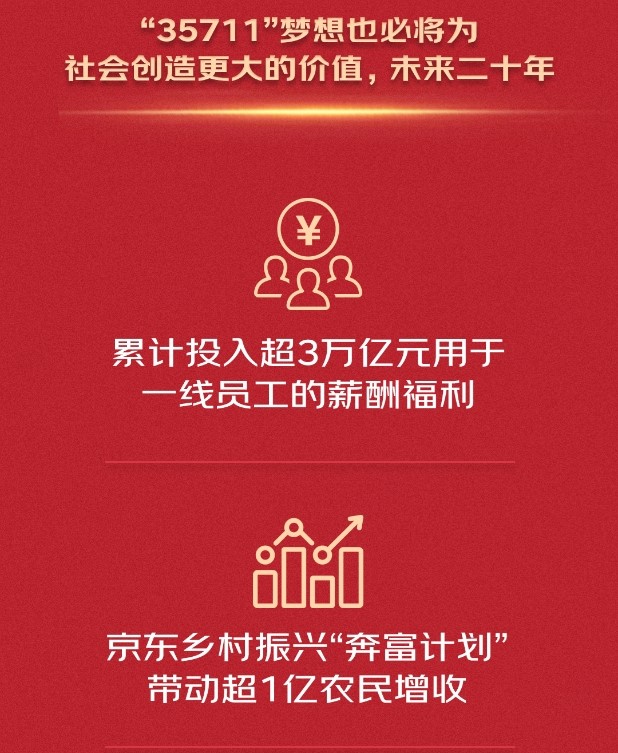 拆解“35711”梦想不难发现,这份企业宏大目标中,继续做大社会价值占据了非常重要的分量——为国家纳税1000亿税收,提供超过100万就业岗位。事实上,京东还明确,未来二十年,将累计投入超3万亿元用于一线员工的薪酬福利;京东乡村振兴“奔富计划”带动超1亿农民增收;累计携手6千万中小微企业数字化升级……在这些雄心勃勃的目标中,京东作为一家新型实体企业自觉把不断提升社会价值融入自身发展当中的决心可以说是呼之欲出。