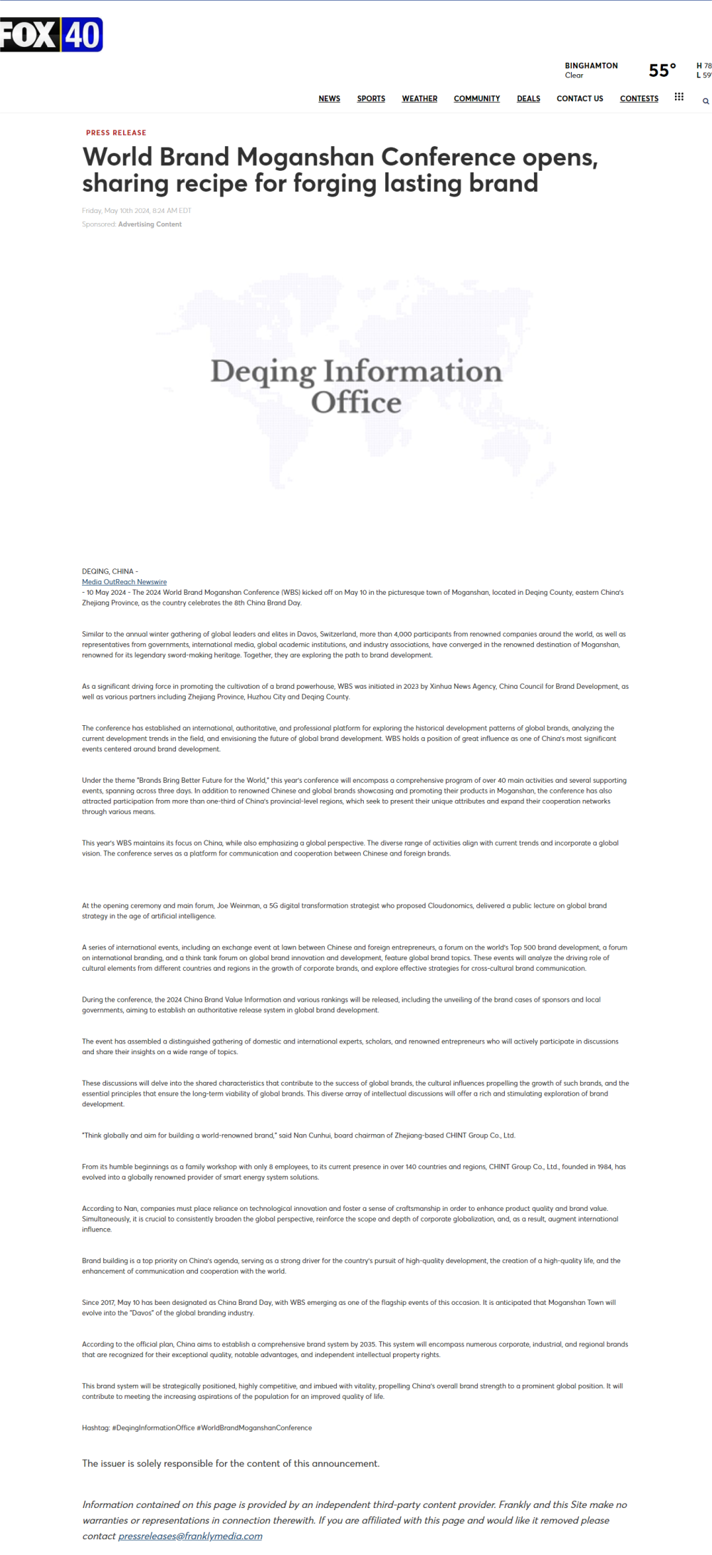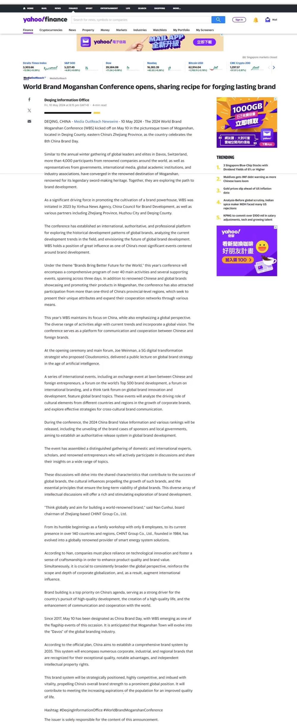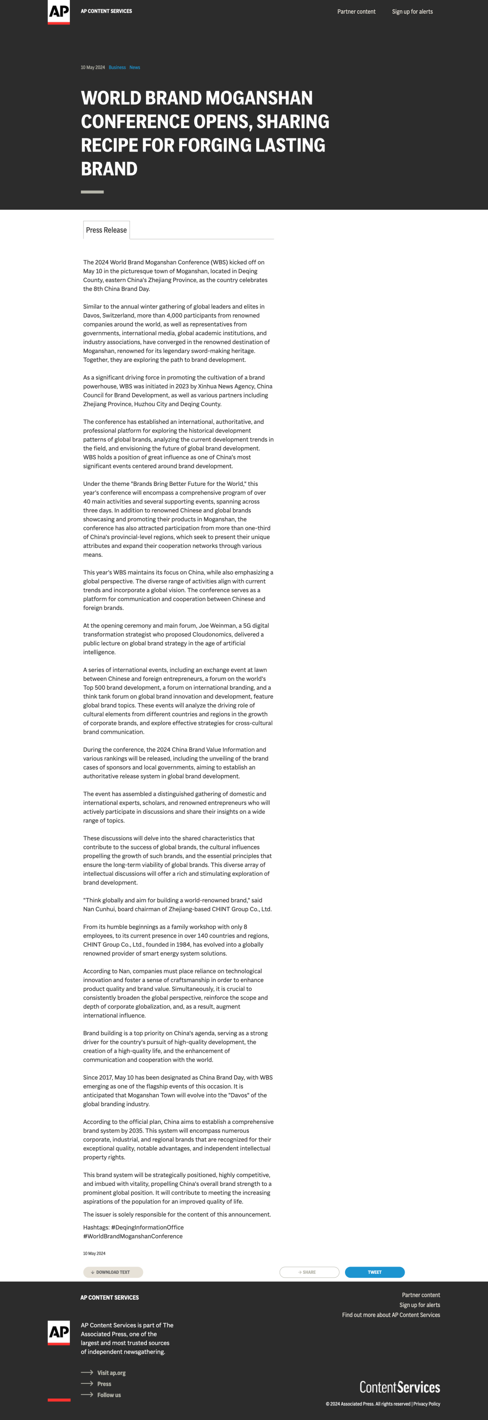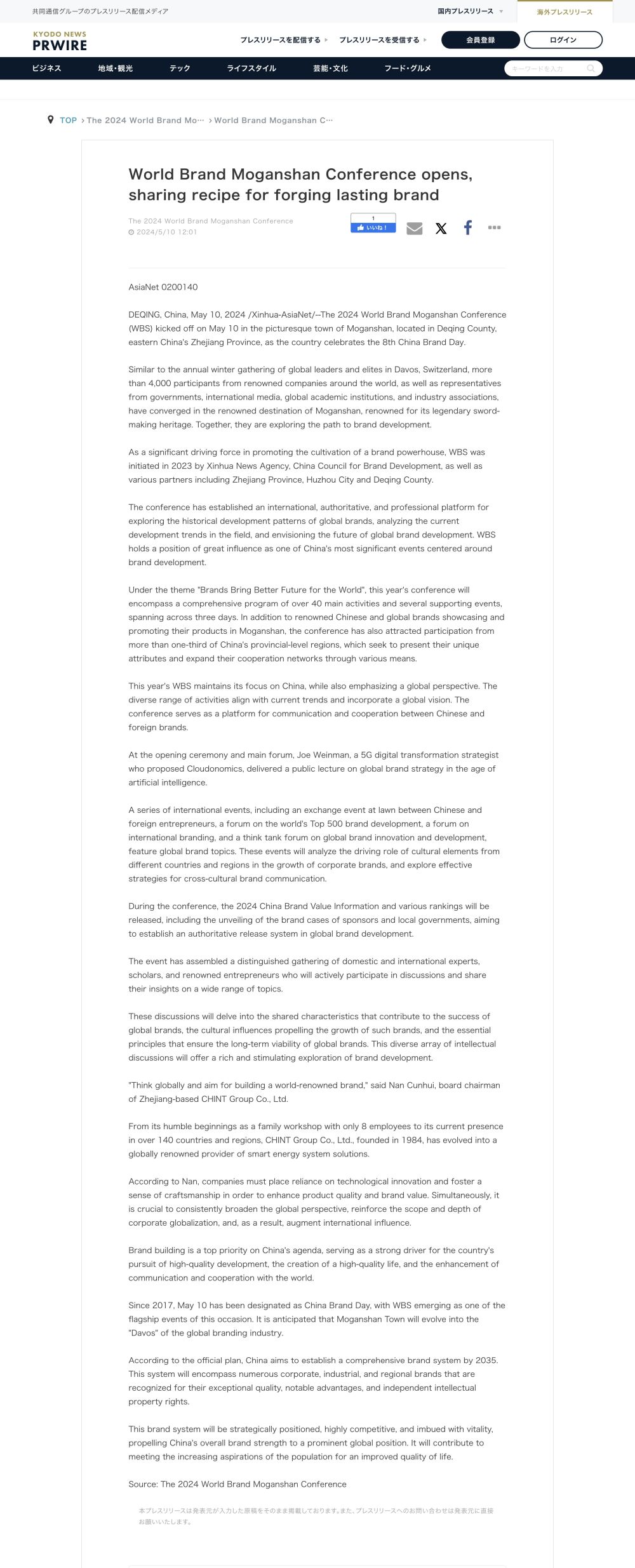 5月10日,来自美国、英国、法国、澳大利亚、日本等国家和地区超过500家通讯社、报刊网站在其官网发布文章《World Brand Moganshan Conference opens, sharing recipe for forging lasting brand》(参考译文:《2024世界品牌莫干山大会举行 探讨新时代品牌长青之道》),聚焦在浙江德清县举行的2024世界品牌莫干山大会,指出大会搭建了探寻世界品牌历史发展规律、解析世界品牌当今发展格局、研判世界品牌未来发展趋势的国际性、权威性和专业性平台,已成为新时代中国高质量推进品牌建设的代表性活动之一,莫干山或将成为世界品牌的“达沃斯”。