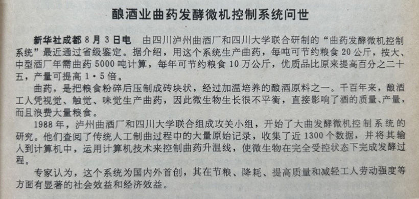 1989年8月3日,新华社一篇题为《酿酒业曲药发酵微机控制系统问世》的报道中,记者讲述了泸州老窖(原泸州曲酒厂)运用“大数据”赋能白酒曲药生产,实现降本增效提质的故事,让人顿觉历史映照现实,感叹企业卓然于时代的风采。