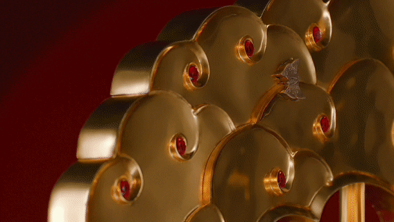 作品前方的酒座,借鉴了中国古建筑中斗拱造型,国窖1573产品鼎立中央,透露出一种轩昂气韵,尽显尊贵与不凡。巧妙的是,国窖1573外盒基座缓缓打开时,仿佛一朵金色牡丹在眼前盛放,瞬间将品酒的仪式感提升至极致。这一设计不仅让人联想到牡丹盛开的春日盛景,更将富贵吉祥的美好寓意融入其中,为品酒体验增添了文化韵味。