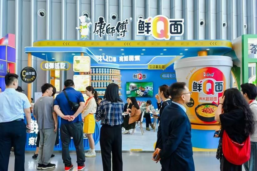 论坛会场之外,康师傅“茶的传人”主题馆通过非遗制茶工艺体验、拍照互动等设计,吸引众多参会者驻足体验。“鲜Q面”主题馆前,工作人员用现煮面品升腾的香气征服过往人群,试吃台前排队者络绎不绝。