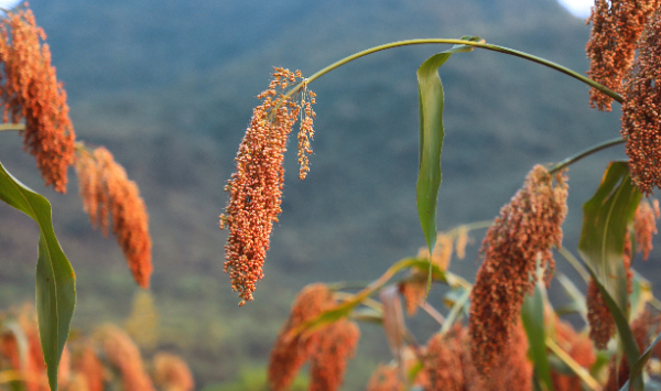粒小皮厚的红缨子糯高粱。