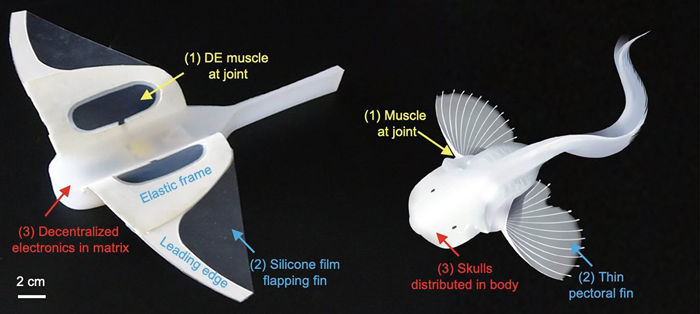 最终,项目组研发出的仿生深海软体机器人果然形似一条鱼,长22厘米,翼展宽度28厘米。该机器人由一种在高压低温环境下依然能保持良好电驱动性能的智能软材料制成,控制电路、电池等硬质器件融于凝胶状的软体机身,无须耐压外壳,便能承受万米级别的深海静水压力。