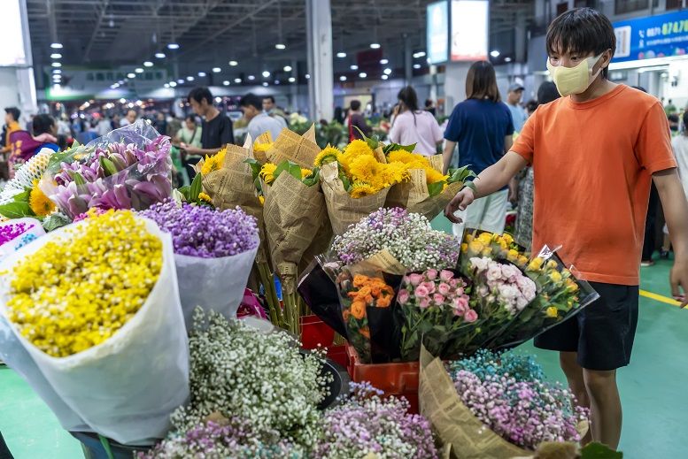 7月12日晚,游客在昆明斗南花卉交易市场内挑选鲜花 陈欣波 摄