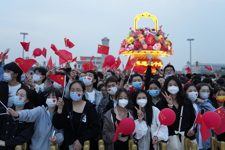 2022 年 10 月 1 日,在北京天安门广场举行的国庆升旗仪式结束后,现场观众挥舞国旗 鞠焕宗 摄