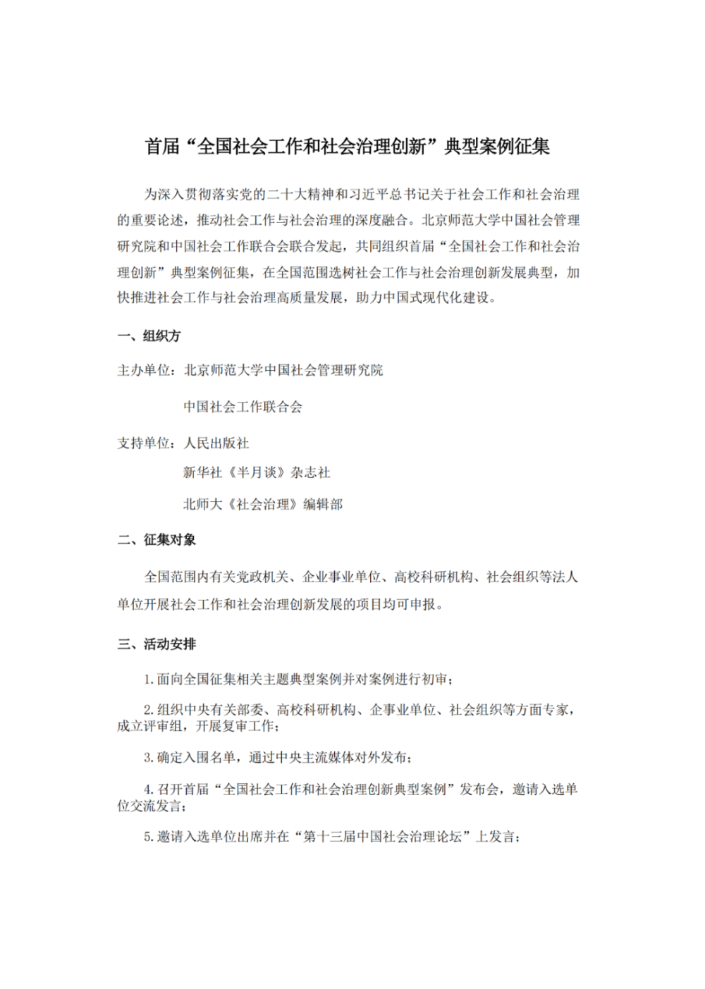 为深入贯彻落实党的二十大精神和习近平总书记关于社会工作和社会治理的重要论述,推动社会工作与社会治理的深度融合。北京师范大学中国社会管理研究院和中国社会工作联合会联合发起,共同组织首届“全国社会工作和社会治理创新”典型案例征集,在全国范围选树社会工作与社会治理创新发展典型,加快推进社会工作与社会治理高质量发展,助力中国式现代化建设。