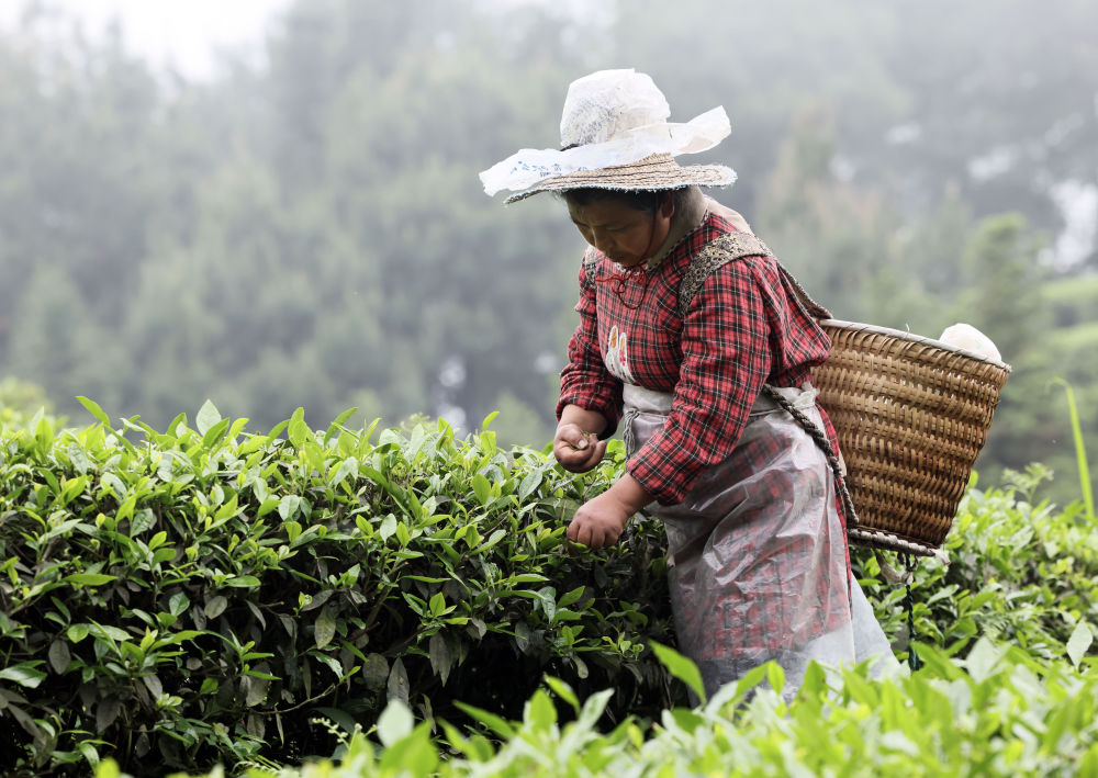 村民在茶园内采摘鲜茶叶 兰红光 摄