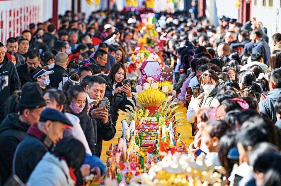 人们欣赏山西省吕梁市岚县岚城镇面塑作品 詹彦 摄