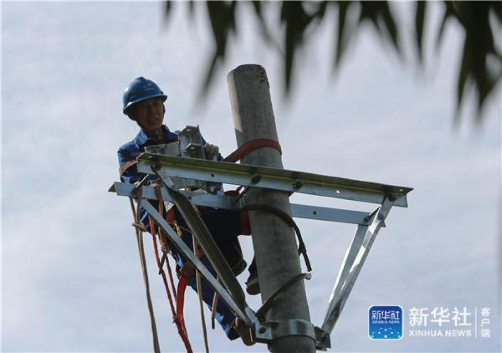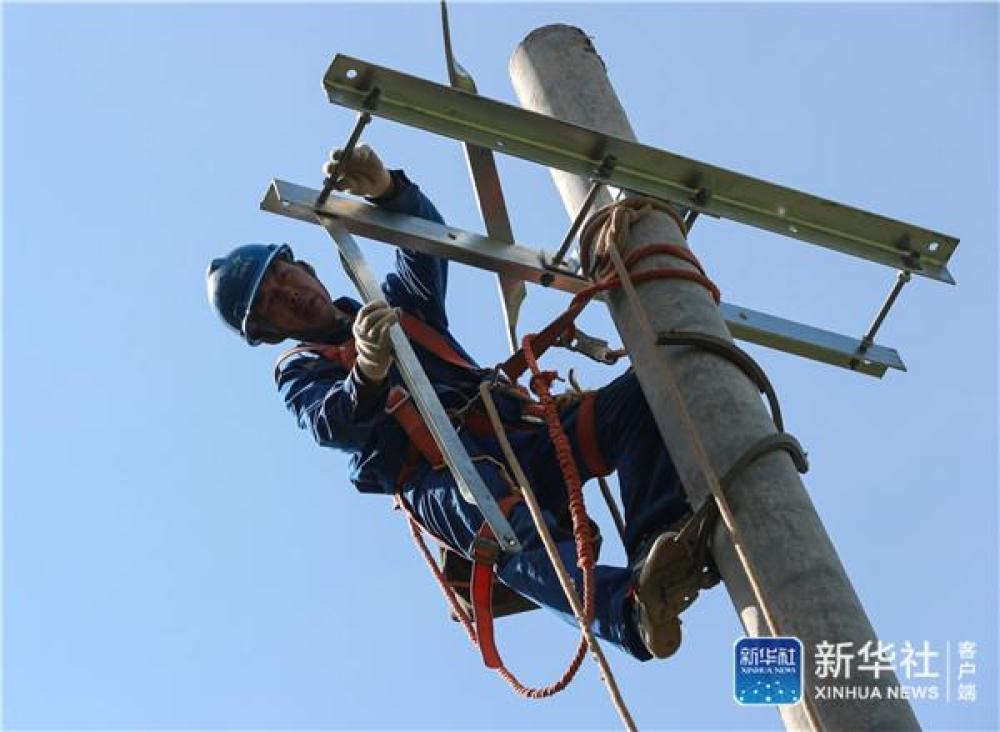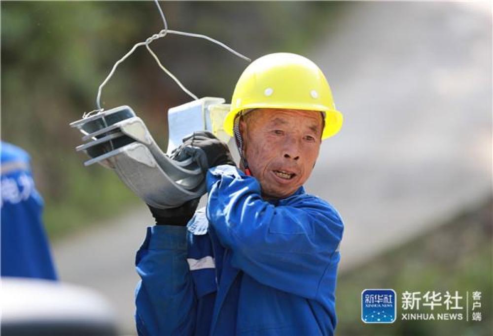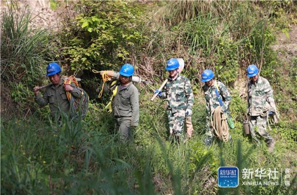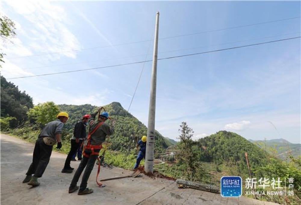 2020年4月24日,在贵州省铜仁市沿河土家族自治县新景镇白果村,来自玉屏侗族自治县电力脱贫攻坚突击队在施工。胡攀学 摄