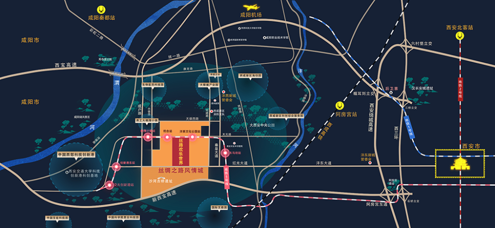 面向城市:在沣西新城城市化的过程中,发挥丝路欢乐世界的引流作用,建设文化教育、大型购物中心、医院、交通枢纽等设施,为辖区提供高品质的公共服务配套。