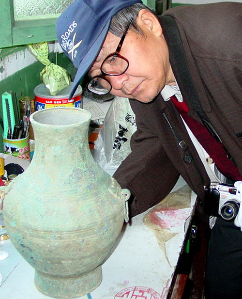 四川大学著名考古学家林向在观看重庆小田溪战国墓群出土的铜壶 杨磊 摄