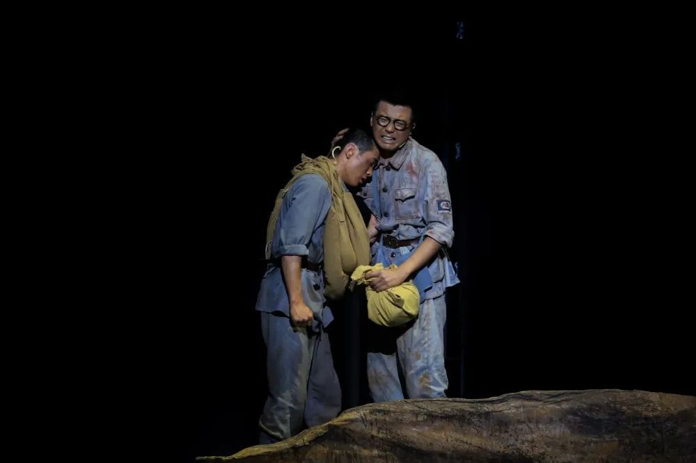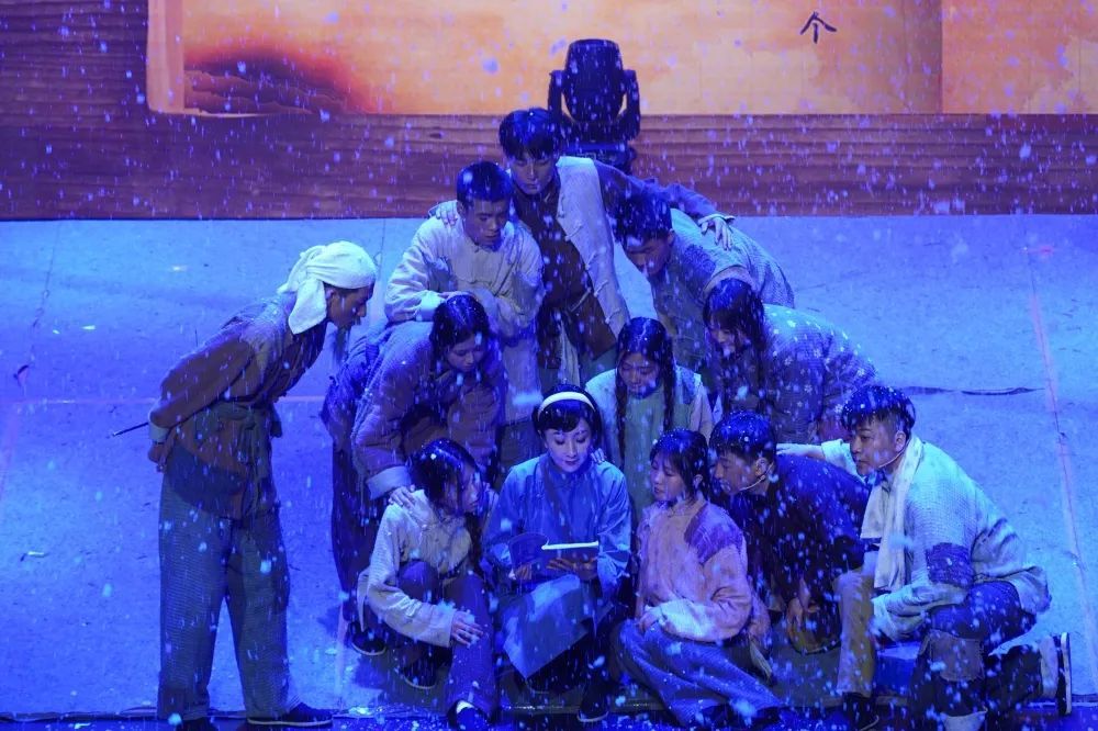 话剧《永远的旗帜》以舞台剧为艺术表现形式,通过“一本大书”“一面党旗”“一块黄金”三段故事,生动再现了广饶老党员珍藏山东第一本《共产党宣言》中文译本,沂蒙老区党员群众守护山东第一面党旗,招远送金部队不畏生死为党中央筹集、输送13万两黄金的感人事迹。参演师生们以高水准的表演追述革命历史,演绎红色传奇,在情感交织、精神碰撞的交融中打破时空界限,传递革命精神、赓续初心使命,引发现场观众的强烈共鸣。