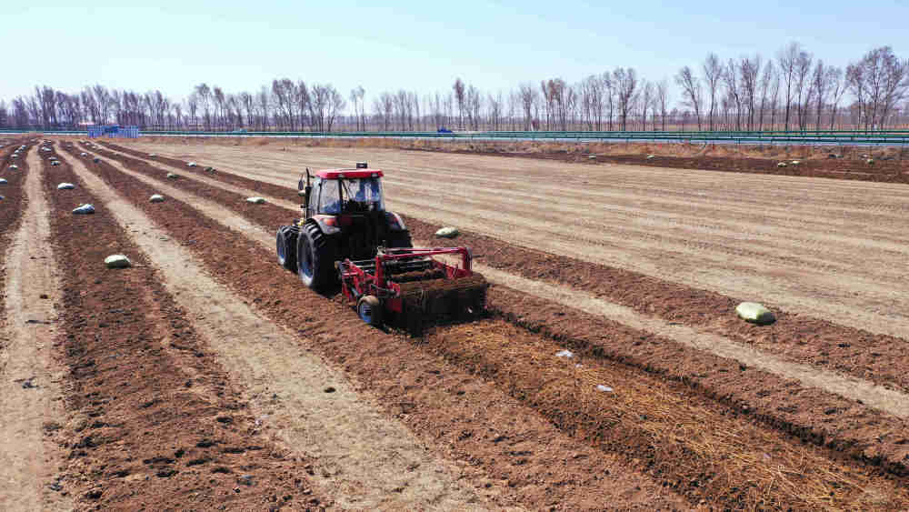 内蒙古自治区通辽市奈曼旗中药材(蒙药材)科研示范基地内,农机在收获黄芪种苗