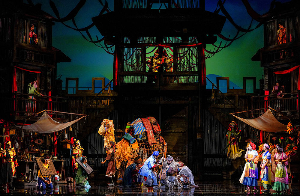 舞台之上,汉代长安市集的繁荣景象、西域独特的风土人情,在悠扬曲调的烘托中越发富有沧桑之感,高还原度的场景打造将观众深深拉入对遥远丝路的浪漫想象之中……